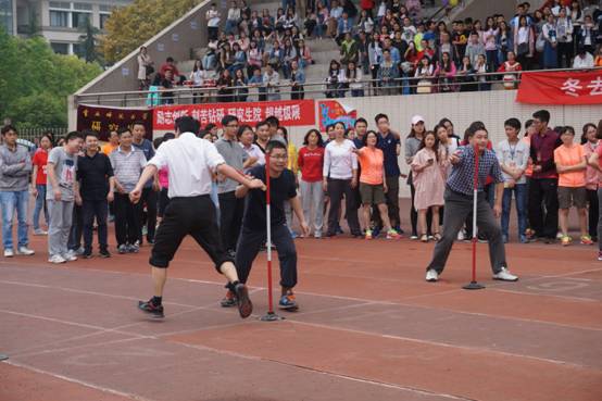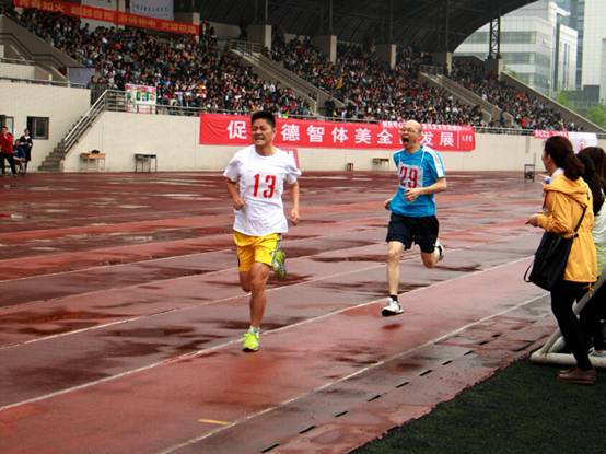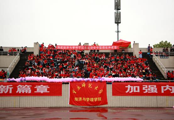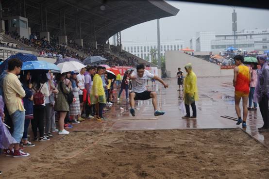 比赛中的选手们雨中翱翔,勇往直前。看台上的同学们激情不断,锣鼓喧天,呼叫呐喊“经管加油!”、“经管最棒!”为每一个在赛场上努力的人儿鼓劲加油。同时,已经是大四即将面临毕业的李族同学,为了学院的荣誉,请假返校,为院争光,再创辉煌。