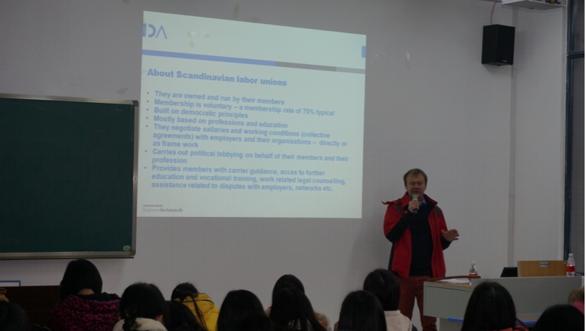 讲座中,Fin Krogh Jorgensen 先生首先分析了斯堪的纳维亚地区劳动力市场社团模式的管理或调节情况,并与包括中国在内的世界各国劳动力市场的基本情况进行了对比,列举了大量翔实的数据。最后,Fin Krogh Jorgensen 先生以现货的事例,论证了灵活的社会保障体系,工作与生活的相互平衡,工作文化以及劳动市场的工作环境是有助于劳动者的幸福感的这一结论。
