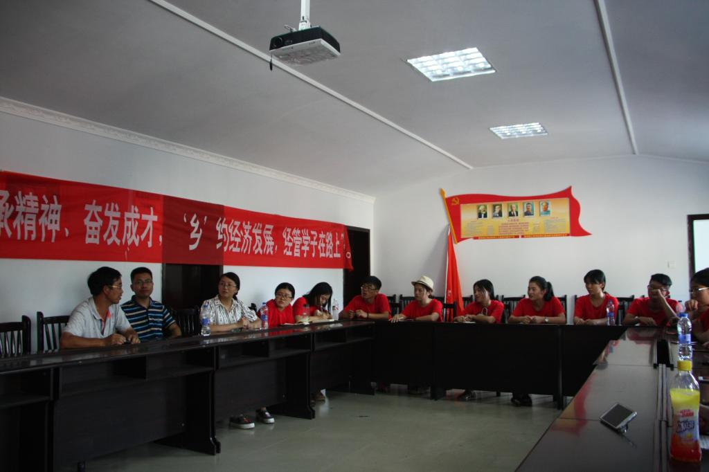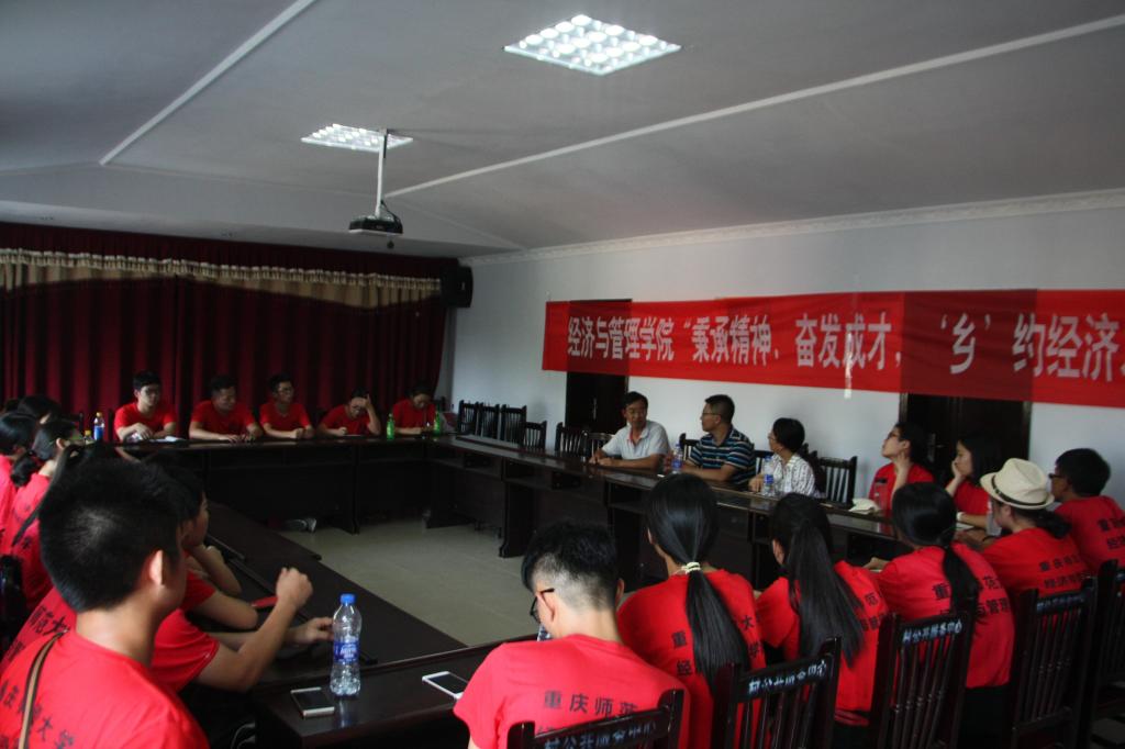碧玉青山,风清云白,经过4小时的车程,车盘村的娟丽风景映入眼帘。稍事休息后,全队人员来到车盘村的村委会与村支书任老师进行了亲切的交谈。任老师分别以自然资源种类、经济收入来源、交通设施设备等介绍到车盘村的发展历程,他表明遵循“十三五规划”,车盘村巧妙利用丰富的自然资源和宜人的天气环境大力开展旅游业,深入“两学一做”,强力推进白马山旅游扶贫开发。同时也讲到村中多数农户以种植烟叶为经济来源,返乡的青年相应号召将农家乐生意做到如火如荼,带动了车盘村经济的有效增长。