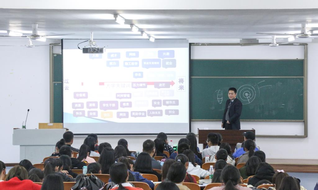 讲座伊始,任老师通过PPT展示一系列关于“大学”的关键词,让同学们自己思考已经度过的一个月大学生活,跟自己预期的大学生活有何差别。接着,任老师就学院就业形势状况阐明了学识与能力建设对于以后就业的重要性,并通过催眠游戏让同学们放松身心,想象出未来的自己以及想要的生活。随后,任老师告诉同学们该如何拥有相对稳定的关系圈,并告诉同学们要学会倾听与倾诉以缓解压力,悦纳自己。最后,任老师特别强调了安全意识的重要性,防骗防盗,告诉学生禁止参加未经学校认可的活动社团。