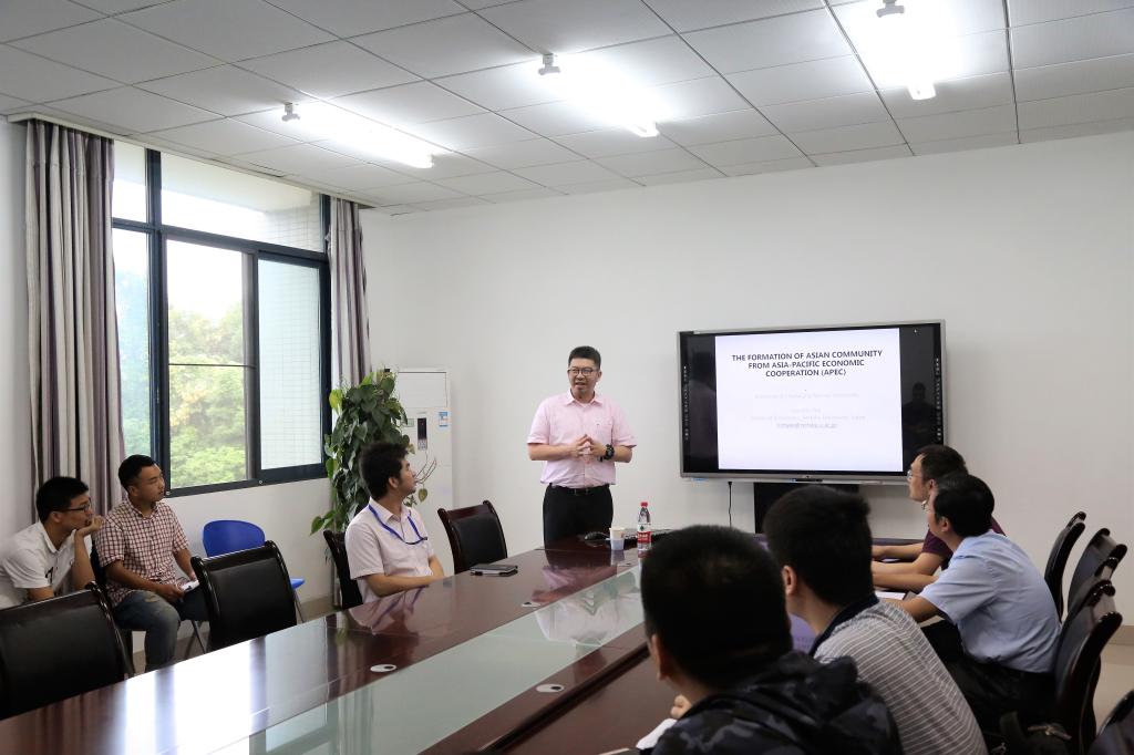 讲座围绕Asia-pacific economic cooperation(亚太经合组织,简称APEC)、Free trade(自由贸易)、Protectionism(保护主义)三个长期占据经济、国际政治领域的热门话题展开。刘心义教授分析了加强中国与亚太经合组织其他成员的双边关系、加强合作,促进互融共通,带动双边关系共同发展的重要性。刘教授指出:在经济全球化的大环境下,各国经济往来也更加密切,而国际间贸易壁垒、贸易保护主义却愈演愈烈,严重阻碍了经济全球化的进程。因此,中国与亚太经合组织其他成员更应该积极调整对外经贸政策,打破贸易壁垒,掌握经济发展的主动权,进行自由贸易,致力于建立一个可持续发展与繁荣和富有活力的共同体。