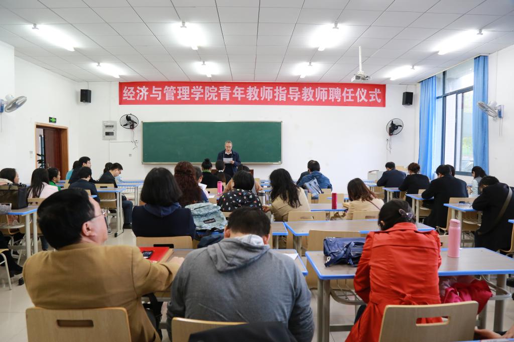 于2018年11月1日在汇贤楼102教室举行青年教师指导教师聘任仪式。仪式由学院副院长陈道平主持,学院全体教师出席。