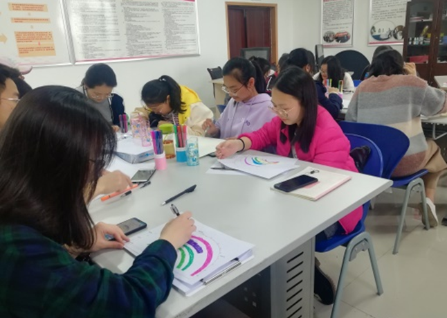 首先,胡雪梅老师以旅游行程的前期准备工作引导同学思考什么是职业生涯规划,为什么要进行职业生涯规划,并对生涯规划的重要性进行了探讨。接着,胡老师详细讲述了舒伯的生涯彩虹图理论及各个阶段和所承担的角色。在胡老师的指导下同学们开始绘制生涯彩虹图,同学们用五颜六色的水彩笔描绘着属于自己的彩虹图,每一个细节都要思考未来角色的时间跨度,角色中时间和精力的投入度。最后,同学们以生涯彩虹图中最看重的部分进行了分享。最触动大家的是当同学们谈到自己子女角色的终点时想到父母的养育之恩。胡老师带着同学们一起比较了每个年龄阶段所承担的角色时,同学门幡然醒悟,学生时代所承担的角色数是最少的,更应该全力以赴为未来积蓄力量。