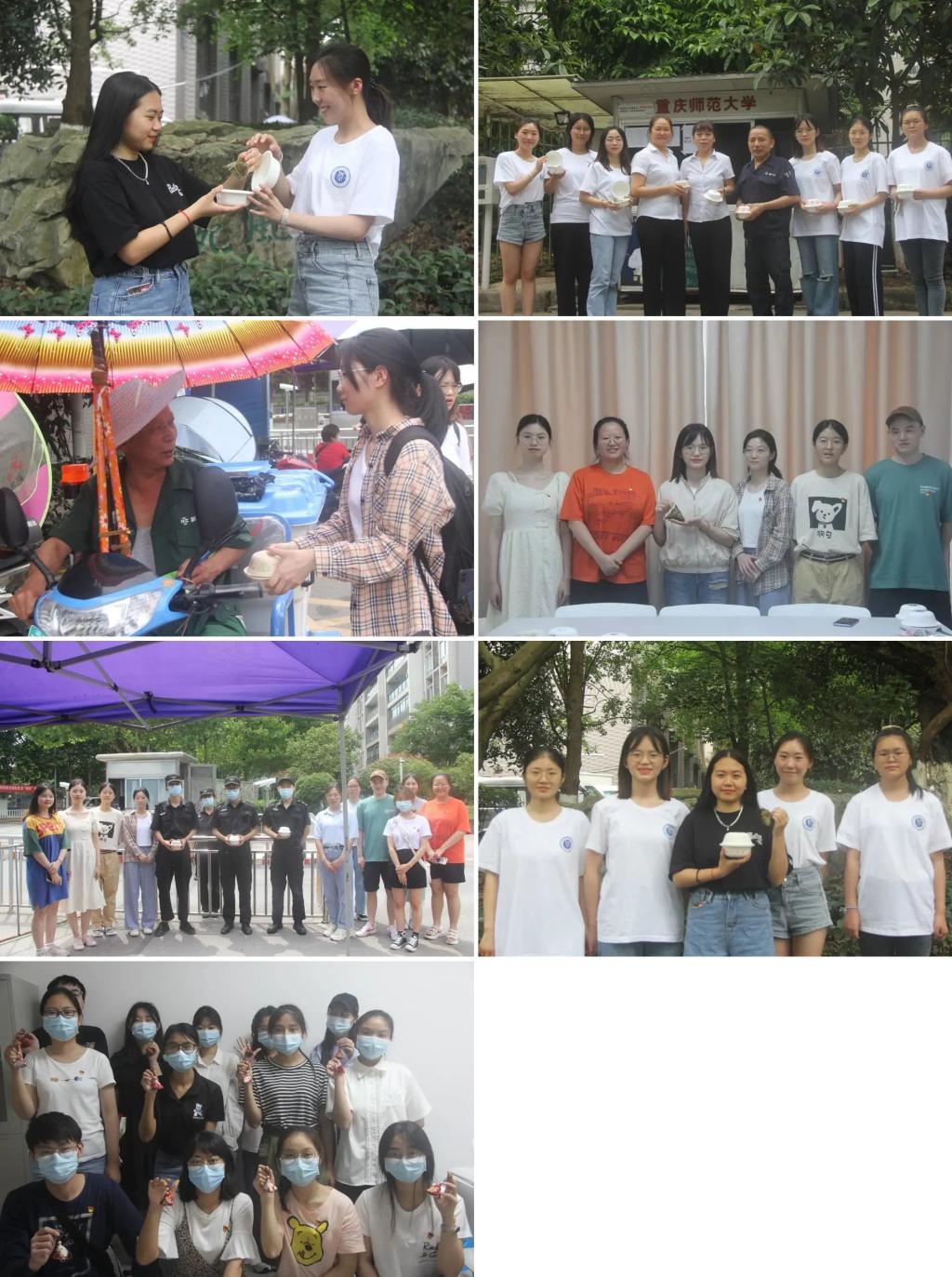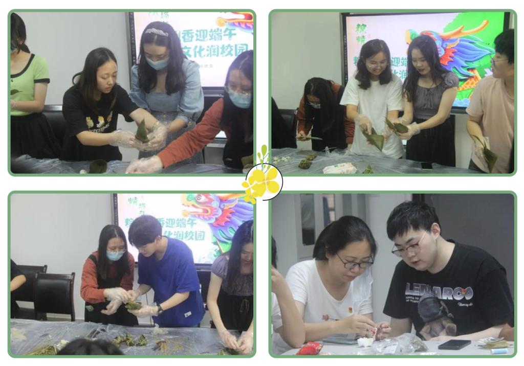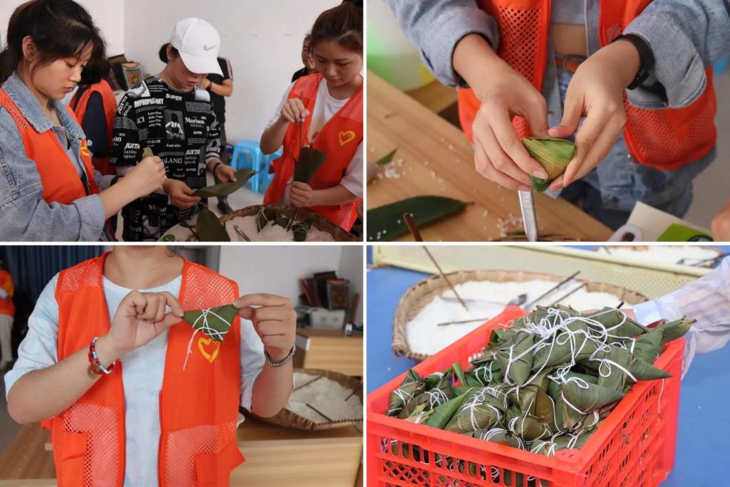一是“粽叶飘香迎端午,传统文化润校园”活动。首先,党员同志和志愿者分成三组制作粽子和香囊;随后,将粽子送至食堂烹饪;最后,党员同志和志愿者将打包好的粽子和香囊赠予校园中的劳动者、少数民族和学生代表等,齐邀大家共享节日喜悦。