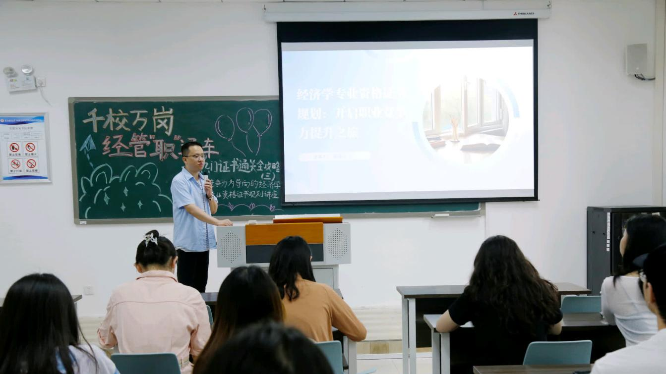 于求是楼215举办热门证书通关全攻略系列讲座(第三期),本次讲座特邀经济学系讲师张泽义博士主讲,并邀请两位考取银行从业资格证的同学分享备考经验。
