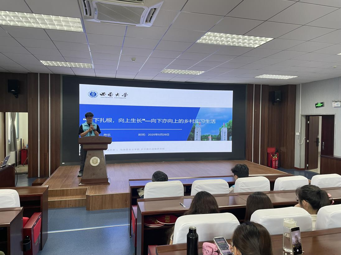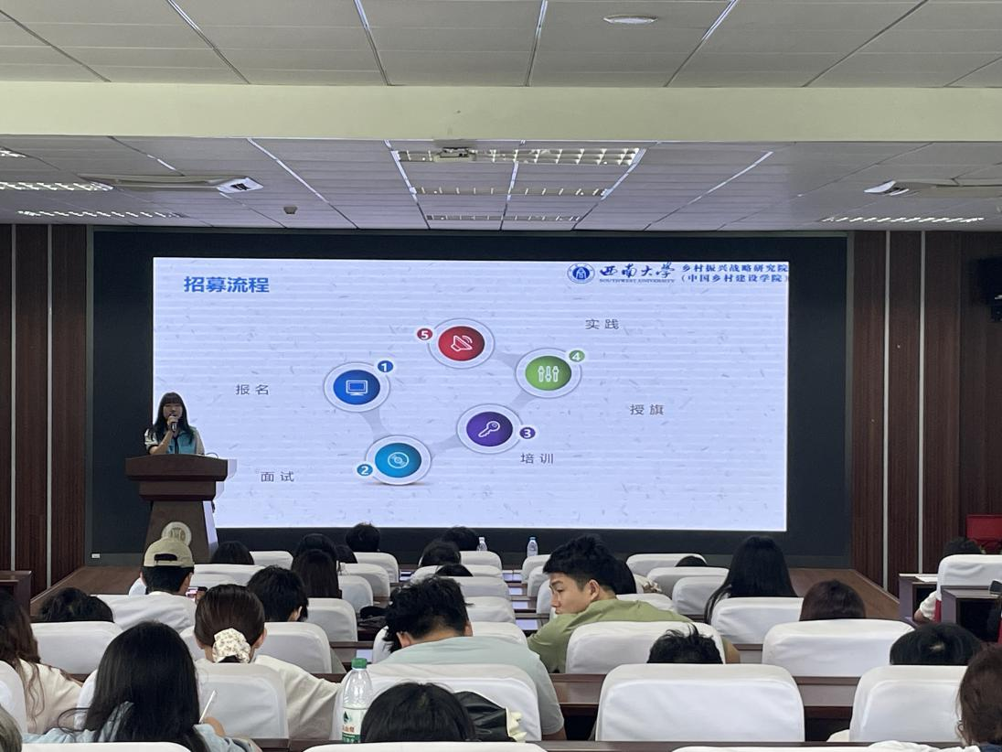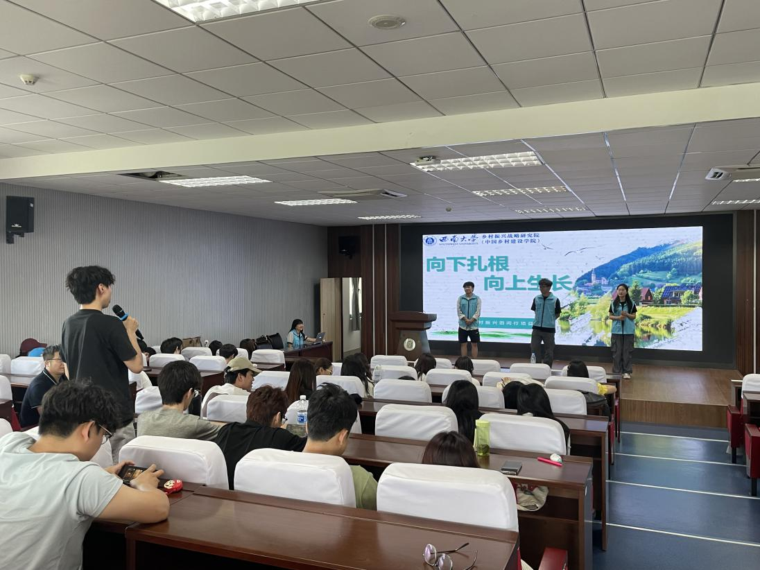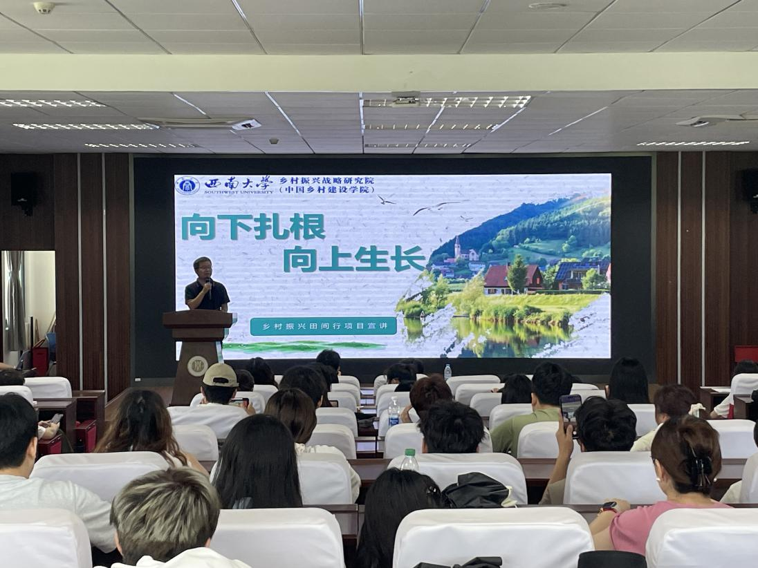 宣讲伊始,张斌对"向下扎根,向上生长"乡村振兴田间行活动作了简要介绍。该实践活动由西南大学乡村振兴战略研究院为积极响应国家乡村振兴战略号召,自2021年起策划实施。活动构建了乡村振兴田间行“志愿者计划”与“实习生计划”两大核心板块,旨在为乡村振兴事业输送专业人才,推动乡村经济、文化等多方面发展。