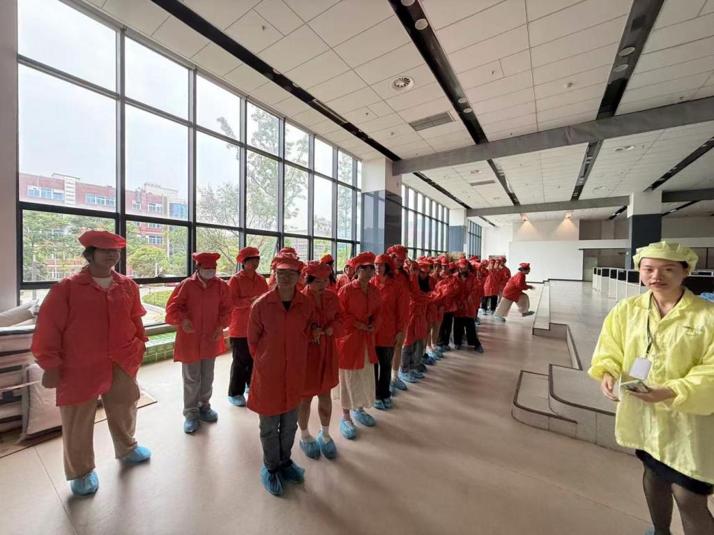 活动伊始,同学们首先在大厅更换静电服、鞋套和帽子,并认真聆听工作人员关于参观产线的注意事项提醒。随后,大家有序乘坐电梯前往4楼贴片和3楼组装线体进行参观。车间内,智能设备高效运转,机械臂精准作业,先进的智能自动化生产流程呈现在眼前。同学们穿梭其间,仔细观察每一个生产环节,深刻感受到现代制造业的智能化与高效性,也对生产制造环节的精密与规范有了直观认识。