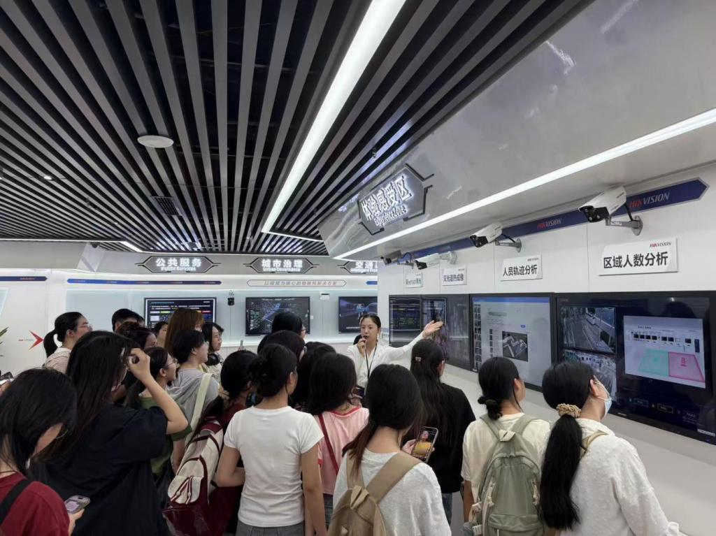 结束产线参观后,同学们来到展厅进行参观学习。讲解员详细介绍了海康威视的发展历程,从创业初期到逐步成长为行业领军企业,展现了企业不断创新突破的奋斗轨迹,同时深入讲解了海康重庆科技园的建设情况以及重庆业务的整体布局。在体验区,同学们亲身体验各类监控产品,感受智能产品在安防、城市管理、生活服务等多领域的广泛应用,切实体会到科技赋能生活带来的巨大变革。