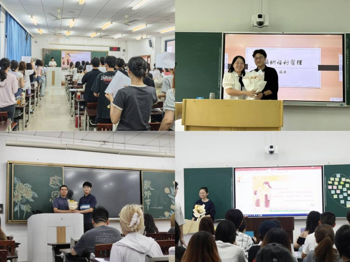 清晨的课堂,洋溢着温馨与感动。课前,各个班级的同学们便忙碌起来,他们精心制作PPT,挑选舒缓的背景音乐,只为营造一个充满暖意的教室氛围。当轻柔的音乐如潺潺溪流般流淌而出,悄然触动着每个人的心弦,整个教室都沉浸在一片温馨之中。任课老师步入教室的那一刻,全体同学齐声起立,用最响亮而真挚的声音道出:“老师,祝您教师节快乐!”简单的话语,承载着深厚的敬意与祝福,老师们脸上绽放出欣慰的笑容。随后,各班班长代表全班同学向老师献上鲜花。一束束芬芳的鲜花,不仅象征着同学们对老师的感激之情,更承载着经管学子对师长教诲的铭记与回报。