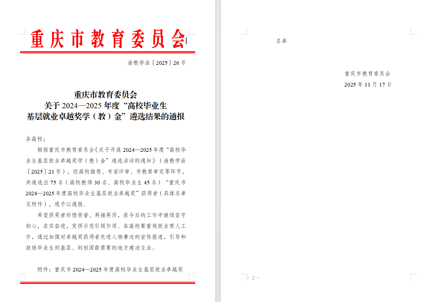 近日,重庆市教育委员会公布了2024-2025年度“高校毕业生基层就业卓越奖学(教)金”评选结果,番号鸽