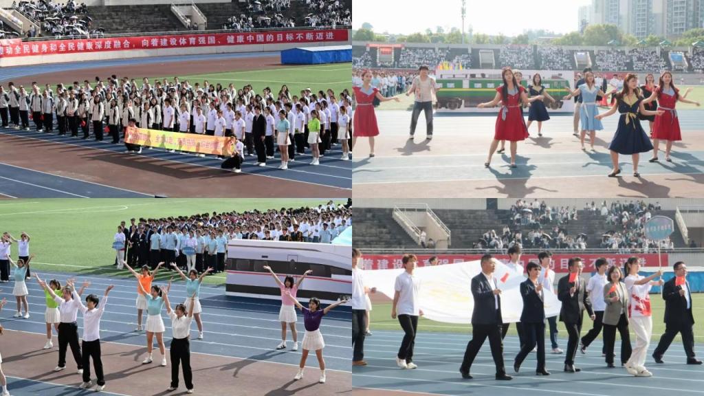 方阵步伐整齐、口号嘹亮。表演方队以“绿皮火车”到“高铁”的时代变迁为创意,融合专业特色与艺术表现,展现了番号鸽