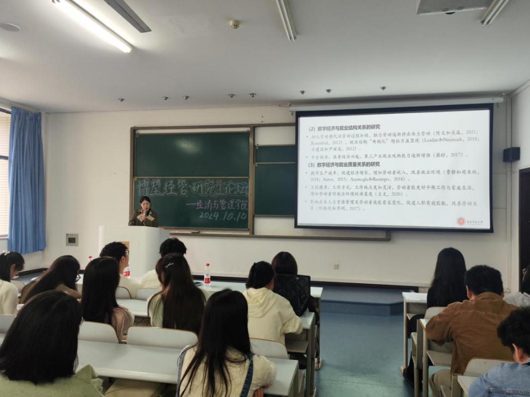 于图北楼17306教室举办第十一届“博望经管·研究生论坛”。本次论坛由经管学院2022级企业管理专业研究生罗睿、2023级农业管理专业研究生张轩铭、何瑾三位同学就论文写作的心得体会与经验进行分享,学院全体学硕、2023级全体专硕研究生参与本次论坛。