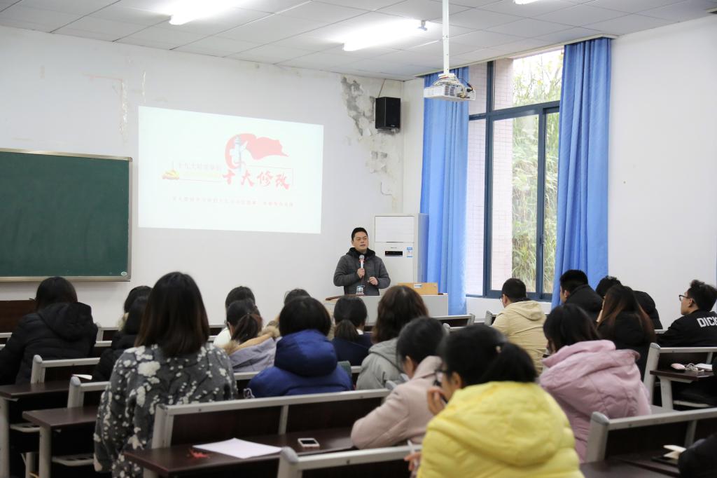 任书记从十九大修改的党章以及写入党章的新思想、新论断、新概念切入,让全体学生党员思考:十九大为什么要修改党章?是否每一届全国人民代表大会都要修改党章?紧接着,任书记就十九大会议中修改和写入党章的两个方面,对党的十九大精神作了全面生动的解读:党章根据我国社会主要矛盾的转化作出相应修改,将习近平新时代中国特色社会主义思想、中国特色社会主义文化、实现中华民族伟大复兴的中国梦、推进国家治理体系和治理能力现代化、供给侧结构性改革、“绿水青山就是金山银山”等新内容写入党章。任书记结合实际、深入浅出进行宣讲、解读,引发了全体学生党员的强烈反响。大家聚精会神地听,奋笔疾书地记,将十九大精神刻印在心。不少与会党员还带着十九大报告学习辅导材料,结合宣讲内容不时对读研习。
