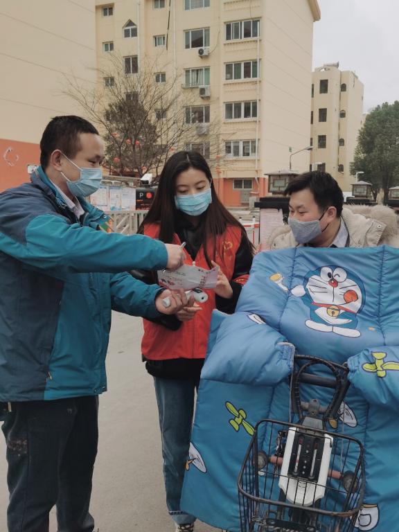 学生三支部学生党员谢雨晴加入了山东省枣庄市市中区十电社区抗击新型冠状病毒志愿者的队伍,通过喇叭、宣传手册等呼吁广大居民戴好口罩,减少外出,不聚众不串门。在小区大门口实施出入管制,检查小区北门过往居民的出入证,以及对非本小区人员、外来车辆进行严格登记、测量体温并及时向上报备。截止目前,她已经进行一个多月的志愿服务。