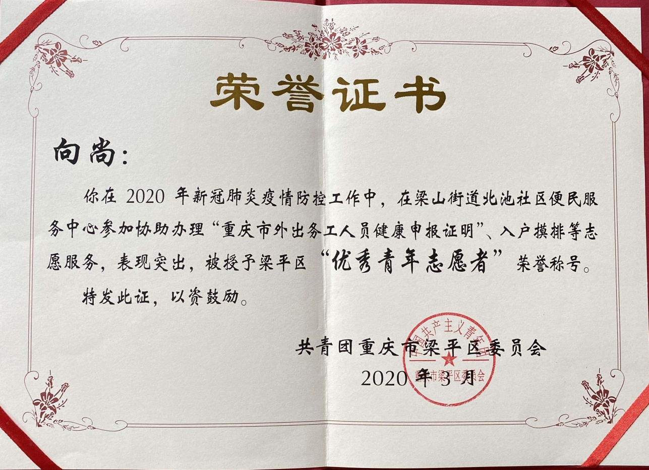 家住在重庆市梁平区梁山街道北池社区的向尚同学,在疫情期间主动加入了当地抗疫志愿者的队伍。她协助社区人员进行走访摸排调查,帮助外地返渝人员签订医学隔离承诺书,办理外出务工人员健康申报证明等。由于表现突出,被授予梁平区“优秀青年志愿者”荣誉称号。