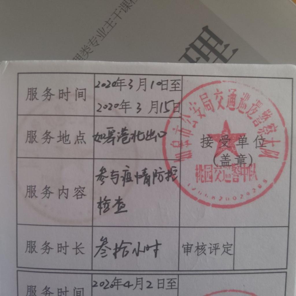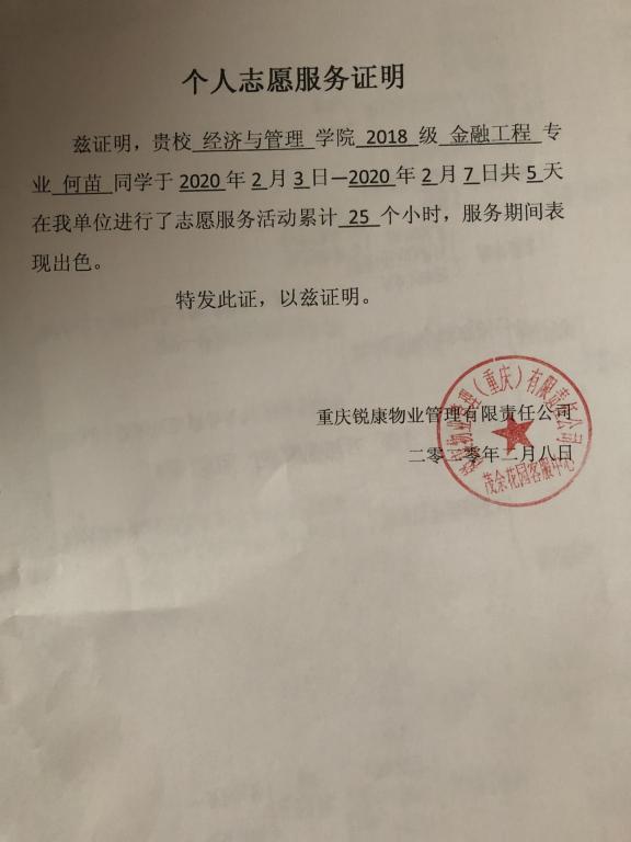 为帮助当地居民早日战胜疫情,李昌晶同学主动参与重庆市江津区几江社区的志愿防疫工作中,参与对出行人员登记、测量体温等。他平均每天志愿时间6小时,用自己的行动向人们传递着无私奉献,舍小家为大家的志愿精神。