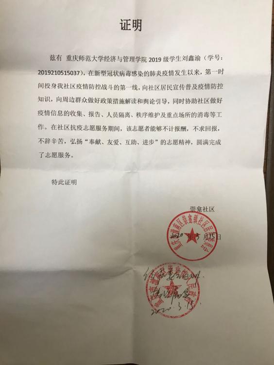 家住重庆潼南区的刘鑫渝参与了当地崇龛社区的抗疫志愿服务工作。他向社区区居民宣传普及疫情防控知识,向周边群众做好政策解读和舆论引导,对社区疫情信息的收集、报告,协助社区进行人员隔离、秩序维护等,确保了社区运行正常。在这一场与病毒的抗战中,刘鑫渝尽心竭力服务自己的家乡,守护了社区区居民的安全,得到了社区居民和辖区领导的一致好评。