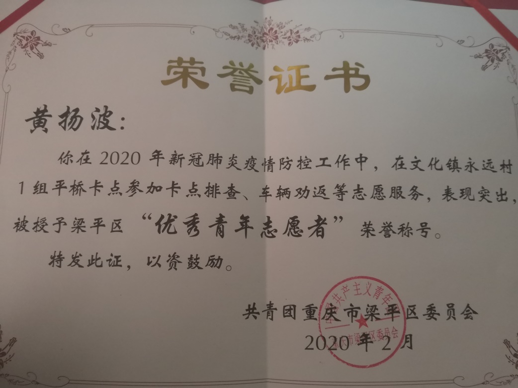 新冠疫情防控期间,黄扬波同学主动参加了重庆市梁平区文化镇永远村的志愿者队伍,进行新冠肺炎防控的宣传,登记,卡点排查,车辆劝返等志愿者服务工作。由于工作认真,表现优秀,荣获梁平区“优秀青年志愿者”荣誉称号!