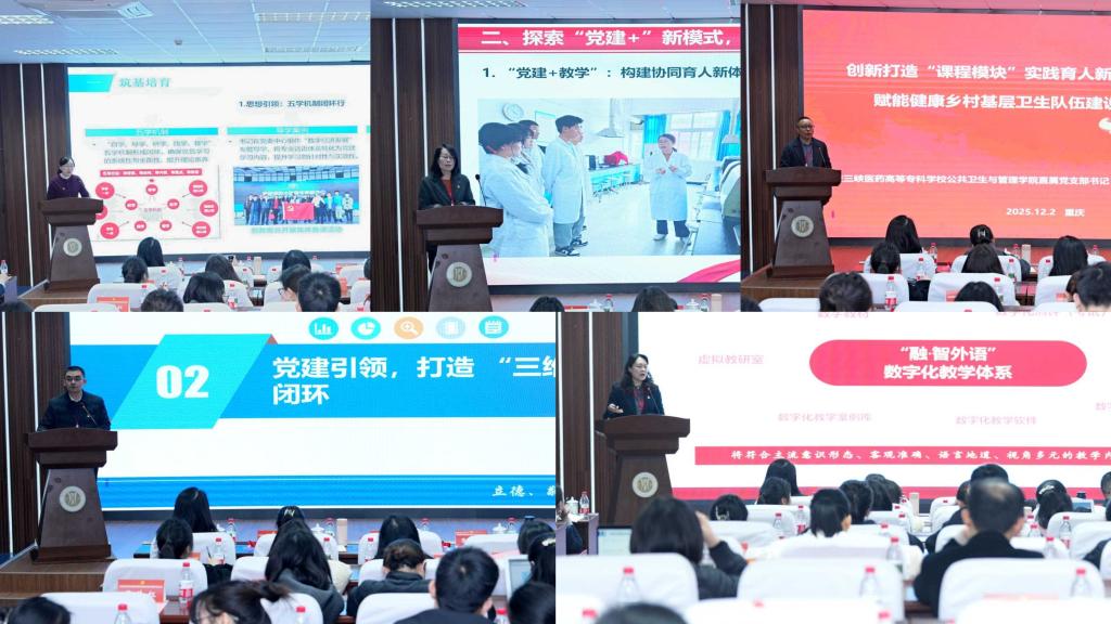 主题分享环节,我校外国语学院党委书记王放以“用外语讲好中国故事——两课贯通融入思想政治教育模式的改革创新”为题,分享了通过语言载体深化思政教育的实践路径;达州职业技术学院临床医学院党总支书记艾水以“探索‘1+1+N’医教协同实践育人模式培养革命老区乡村全科医生”为题,阐述了医教融合赋能基层医疗人才培养的创新机制;重庆三峡医药高等专科学校公共卫生与管理学院直属党支部书记、副院长郑代坤以“创新打造‘课程模块’实践育人新模式赋能健康乡村基层卫生队伍建设”为题,介绍了模块化教学提升乡村卫生服务能力的实践成果;重庆医药高等专科学校公共卫生与应急管理学院副院长段春燕以“探索‘党建+’新模式激活公卫发展新动能”为题,展示了党建引领公共卫生事业高质量发展的典型经验;我校番号鸽