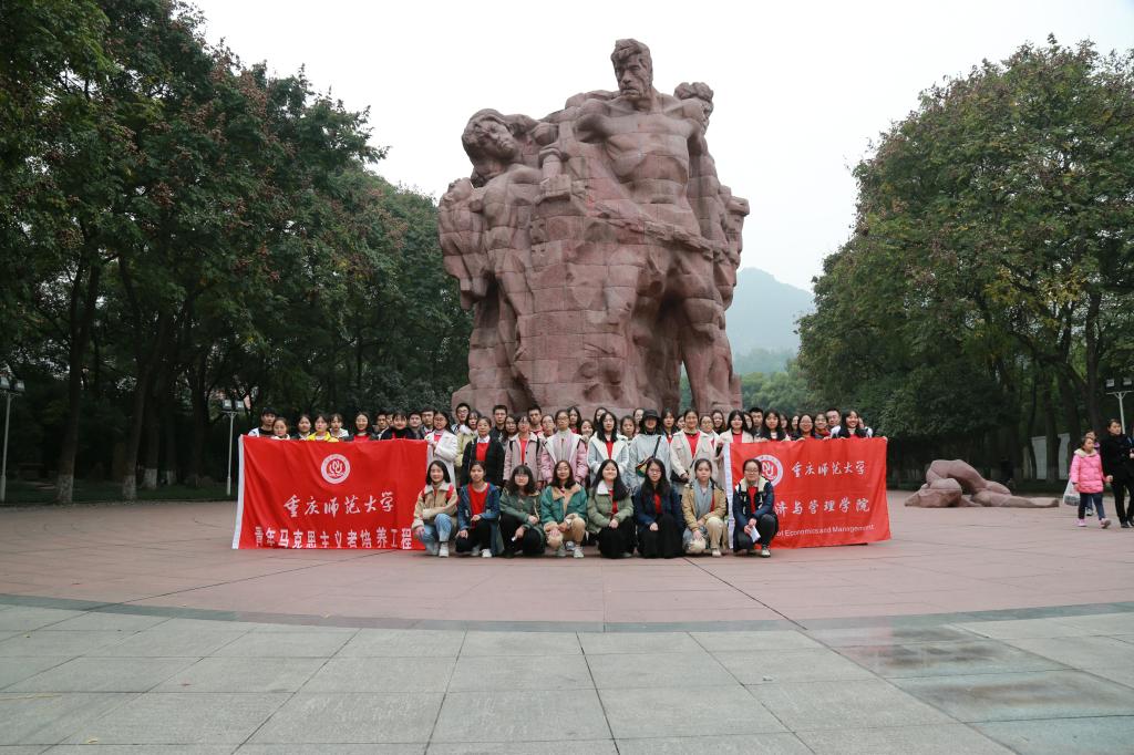 接着是歌乐山烈士陵园。青马班全体人员首先向牺牲的革命先烈敬献花圈;随后,在辅导员柴风梅的领读带领下,集体朗诵曾遭关押的叶挺将军所著的《囚歌》并庄严宣誓:既要铭记历史,弘扬革命的浩然正气,也会注重实践,争做优秀的青年马克思主义者人才。宣誓完毕后,全体人员默哀一分钟,沉痛悼念英勇牺牲的革命先烈,随后为革命先烈献上小白花以表达哀思。活动的最后,全体人员在烈士群雕前合影,以纪念此次红色之旅。