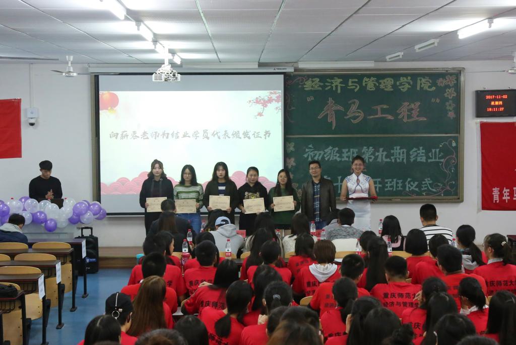 团总支书记朱旭森致辞。朱旭森书记对“青马工程”的培养目标进行详细的阐述,使学员们深入了解青马工程的内涵,朱旭森书记对第九期成果表示充分的肯定,并对第十期学员寄予极大的期望。随后,学院2014级辅导员胡雪梅老师宣读优秀学员、班干部名单并由番号鸽