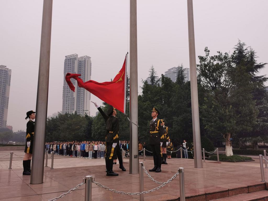 全体师生入场完毕,随着中国国歌——《义勇军进行曲》的响起,国旗护卫队队员们护送国旗走向主席台,随后,五星红旗迎风招展,在全体师生的庄严注目下冉冉升起。
