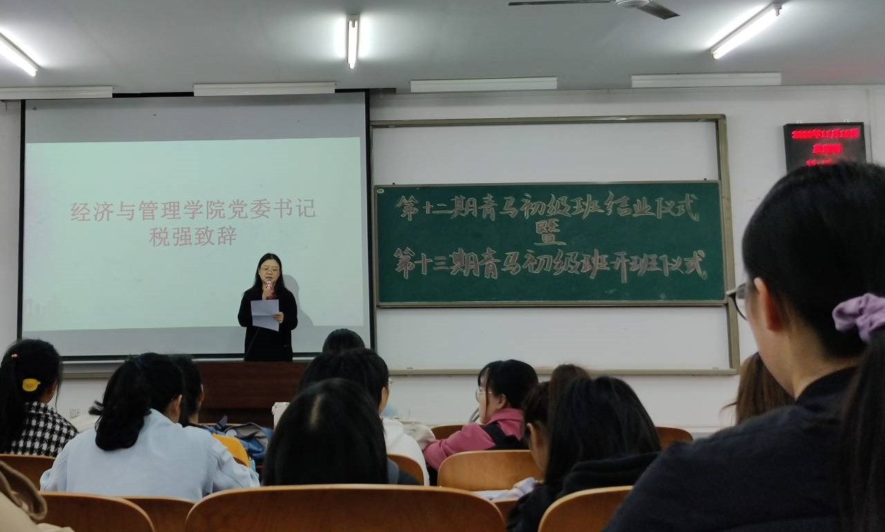 本次仪式由学院辅导员胡雪梅主持,学院党委书记税强、辅导员罗姝、全体青马初级班成员及往届优秀学员参加了本次仪式。在整齐嘹亮的共青团团歌的奏唱声中,开班仪式拉开序幕。会上,税书记向第十二期结业学员表示祝贺,并希望和要求第十三期学员能加强理论素养,坚定理想信念;坚持知行合一,勇于实践;争当先锋模范,甘于奉献社会。随后,辅导员罗姝宣读了第十二期青马班优秀学员名单,宣读结束后,税书记和罗姝老师一起为优秀学员颁发证书。紧接着,第十二期“青马班”优秀学员代表刘畅上台发表感想,他表示,要坚定跟党走好中国特色社会主义道路的信念,认真上好每一堂课,积极参加每一次实践活动,不负青春,不负韶华。