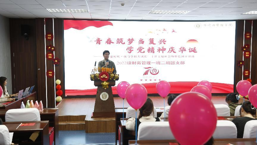 “迎校庆·我与学校共成长”十佳主题班会暨特色团日活动于10月17日在求是楼517成功举行,本次活动的主题为“青春筑梦当复兴,学党精神庆华诞”,由2022级辅导员张源老师主讲,学生处思想政治教育科阿力木·哈斯拉木、数学科学学院分团委书记李晓凤担任本次活动的评委,2022级财务管理专业全体学生参与活动。