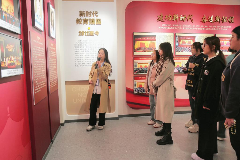 在讲解员的带领下,同学们怀着崇敬与期待的心情踏入这片历史的殿堂,仿佛瞬间穿越时空,与学校的过往紧密相连。校史馆精心布局为五个篇章:“薪火相传,教育救国”、“激情岁月,教育立国”、“春天变奏,教育兴国”、“科学发展,教育报国”以及“新时代,教育强国”。这些篇章深入浅出地追溯了学校深厚的办学根基与光辉夺目的红色传统,让同学们能够清晰地了解到学校在不同历史阶段的发展脉络。
