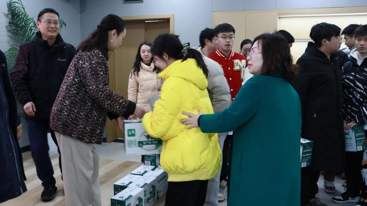 随后,各位领导为考研学子发放了精心准备的慰问礼包,寓意着对他们“能量满满、学思顺遂”的美好期许。
