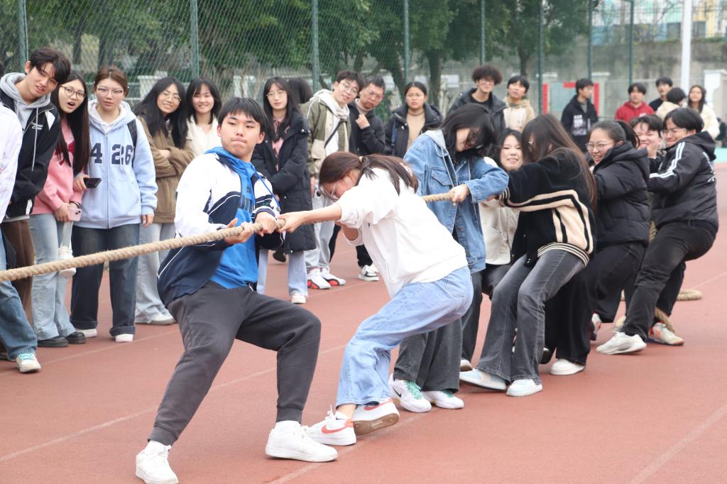 本次比赛以班级为单位组队参赛,采用两两对决的淘汰制,吸引了众多师生关注与参与。比赛过程中,现场气氛热烈。随着裁判哨声响起,参赛选手们紧握绳索,齐声发力,场边观众的加油声此起彼伏,充分展现出师生积极向上的精神风貌。