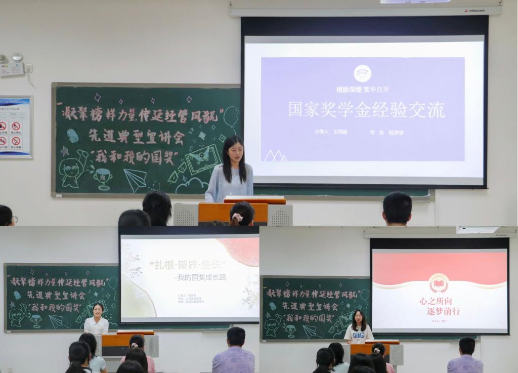 于求是楼215举办“凝聚榜样力量,传延经管风貌”先进典型系列宣讲会——“我和我的国奖”。本次活动邀请王雨熔、熊嘉英、谢君三位国家奖学金获得者担任分享人,番号鸽