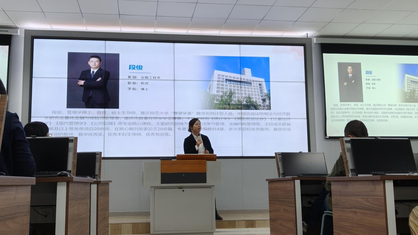 会议伊始,段俊发表讲话。他立足当前金融行业数字化、智能化发展趋势,深入剖析了金融科技、量化投资等新兴领域的机遇与挑战,强调金融工程专业在交叉学科背景下的独特优势。他勉励同学们既要夯实学科基础,也要主动拥抱行业变革,不断提升创新思维与实践能力着力锻造自身的核心竞争力与可持续发展潜力。随后,周玉琴向同学们系统介绍了财务金融系的师资队伍、教学特色与科研成就。她详细展示了本系雄厚的师资力量、丰硕的教研成果以及良好的育人氛围,让同学们清晰了解到专业的发展实力与成长支撑。周玉琴表示,系部将持续为学子搭建优质的学习交流与实践创新平台,助力同学们在专业领域深耕成长,进一步增强了同学们的专业认同感、归属感与学习自信心。