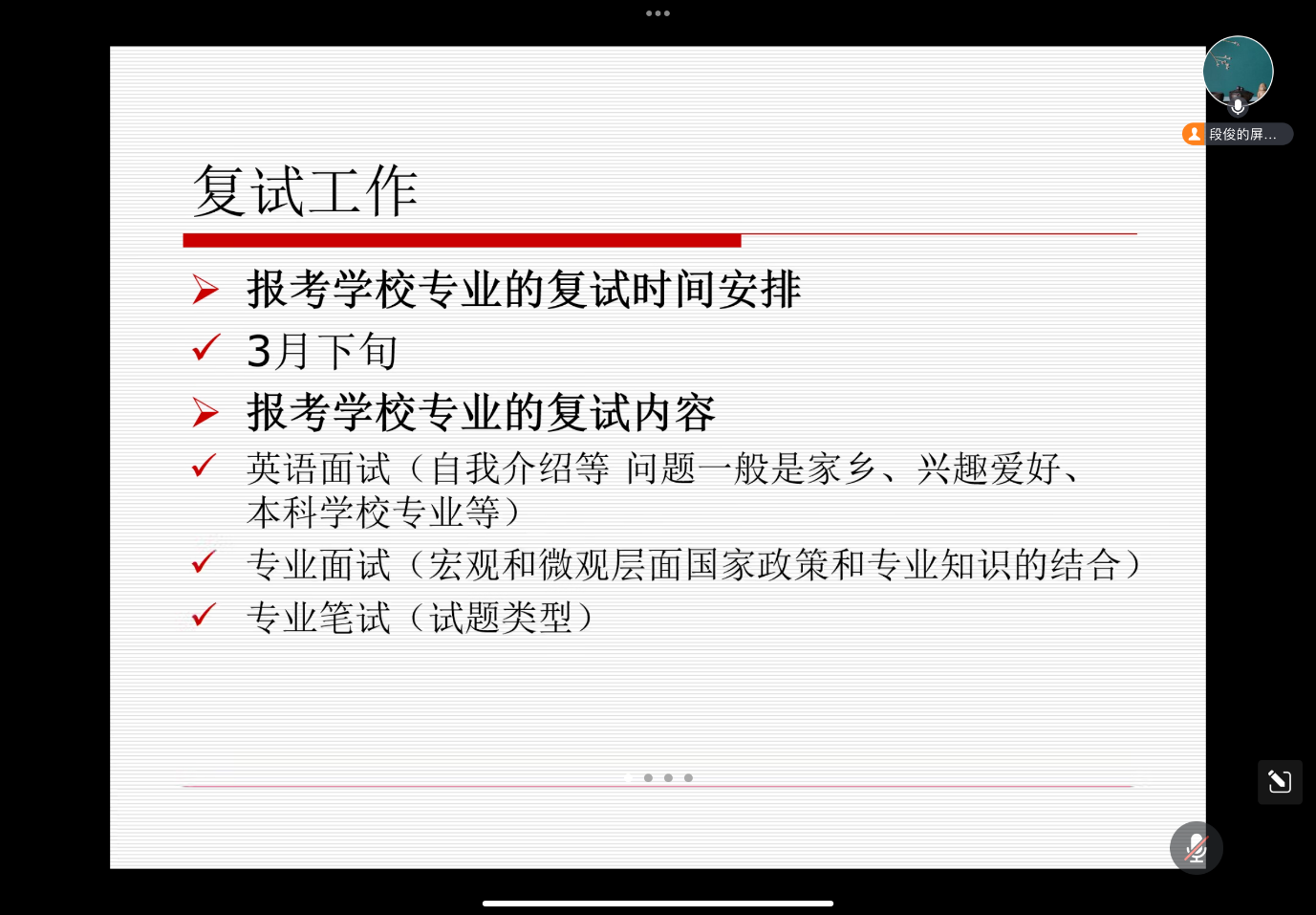 会议伊始,段俊老师向进入考研复试的同学们表示了衷心的祝贺与鼓励,详细介绍了复试流程、需要准备的材料以及如何在面试中做好自我介绍等关键内容,并建议学生应在熟练掌握专业知识的基础上,合理安排复试时间,多多关注时政新闻和国家政策,以更好应对专业面试。在调剂方面,段俊老师则建议同学们从多种渠道入手,在充分了解各大高校的复试信息后,关注各校往年的复试录取情况,谨慎选择热门院校;同时希望同学们能调节好自己的情绪,减少焦虑,在面试中应保持沉着冷静、自信平和的心态,努力展现出最佳状态,顺利通过复试。