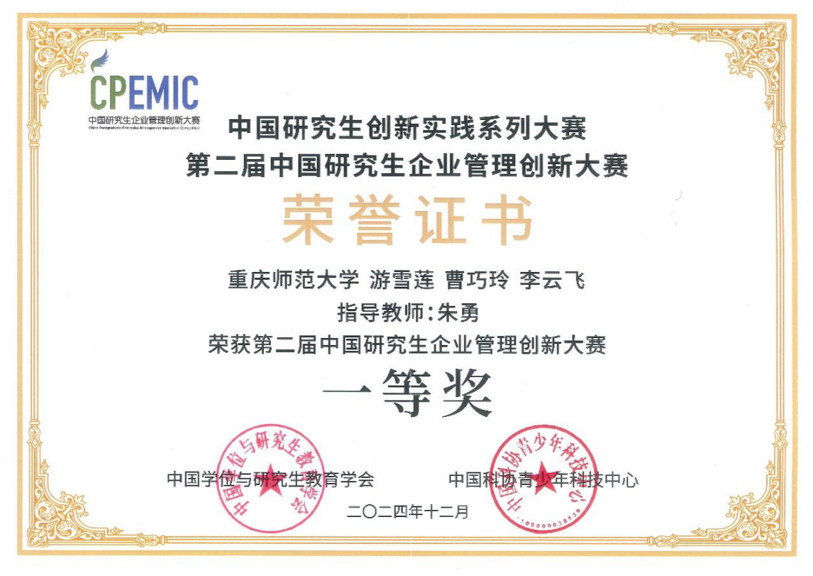 2024级MBA研究生游雪莲、曹巧玲、李云飞组成的团队,在朱勇教授的悉心指导和吕潮琳博士的带领下,凭借出色的创新能力、扎实的专业基础和默契的团队协作,在激烈的竞争中脱颖而出,荣获全国总决赛一等奖!