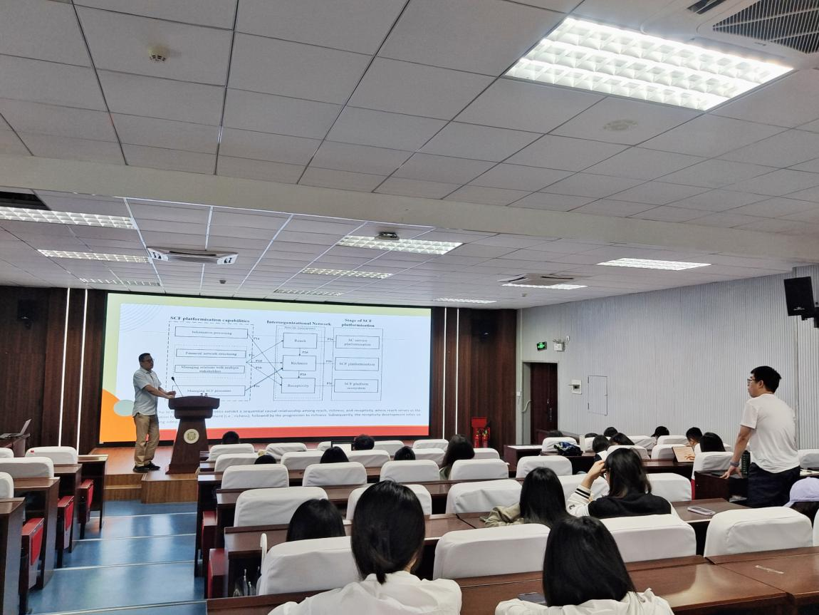 于求是楼517报告厅举办学术讲座,主题为“从平台化到生态化:第三方供应链金融平台如何打造生态系统?——跨组织网络视角”。英国约克大学商业与社会学院供应链管理讲座(全职)教授、可持续性与韧性主题总监贾甫教授应邀主讲,学院副院长陈宇科主持,金融专硕教师及2024级全体学硕、金融专硕学生共同参与。