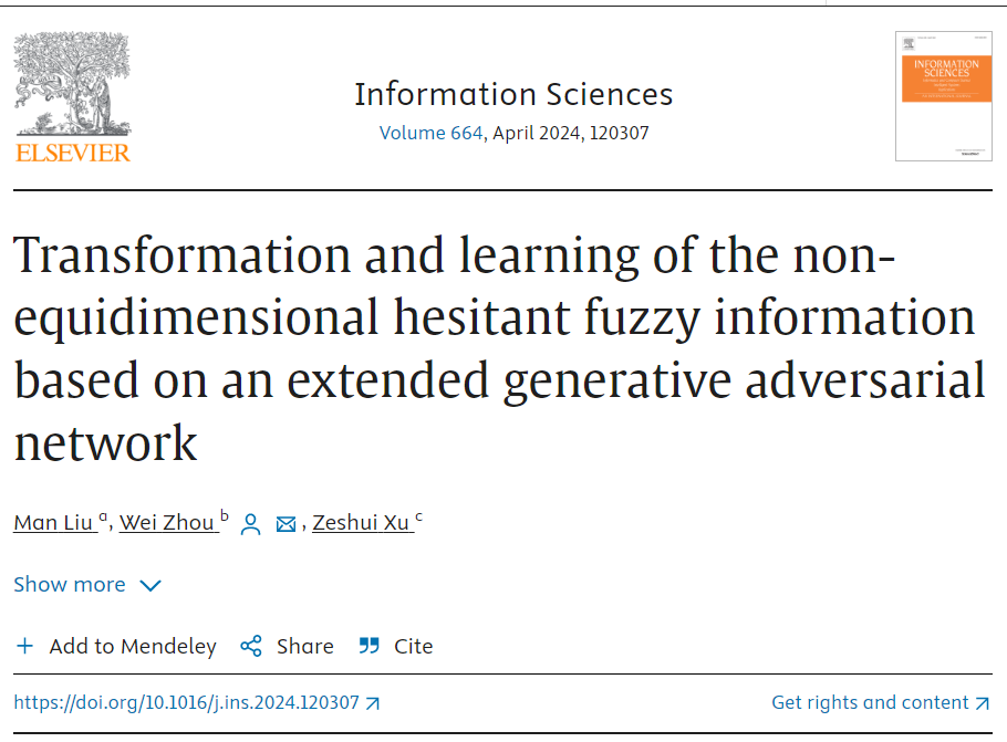 (2)发表于《Information Sciences》(SCI,中科院1区Top, IF: 8.1)的论文“Transformation and learning of the non-equidimensional hesitant fuzzy information based on an extended generative adversarial network”,其中,柳曼为第一作者,学院为第一单位;