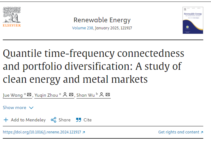近日,学院王珏副教授撰写的论文Quantile time-frequency connectedness and portfolio diversification: A study of clean energy and metal markets在Renewable Energy公开发表。