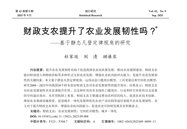杜家廷教授与其合作者的科研成果在统计领域权威期刊《统计研究》2025年第9期正式发表,该论文题目为“财政支农提升了农业发展韧性吗?——基于静态凡登定律视角的研究”,杜家廷教授为第一作者。