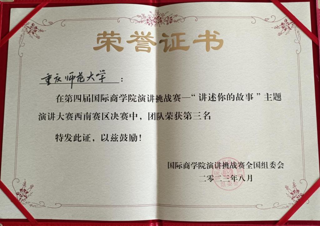 据悉,国际商学院演讲挑战赛分院校选拔赛、赛区总决赛、全国总决赛。我校经管学院21级MBA学生游琴、21级MBA学生苏杭、22级MBA学生李组奎在校选拔赛中脱颖而出,获得西南赛区总决赛入围资格。8月27日,在校MBA联合会学术部部长滕雨薇带领下,参与西南赛区总决赛争夺,游琴、苏杭、李组奎三位同学为我校摘得团队第三名,获全国总决赛入围资格。