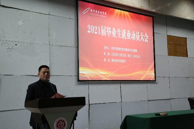 2021届毕业生就业动员大会于陈性初学术报告厅隆重召开。学院党委副书记任源钢主持大会。学校招生就业处副处长田力,学院党委书记税强,副院长(主持工作)郑景丽,副院长喻科、陈道平,系主任、教工支部书记、办公室主任、教科办主任、全体辅导员及2021届全体毕业生出席此次大会。