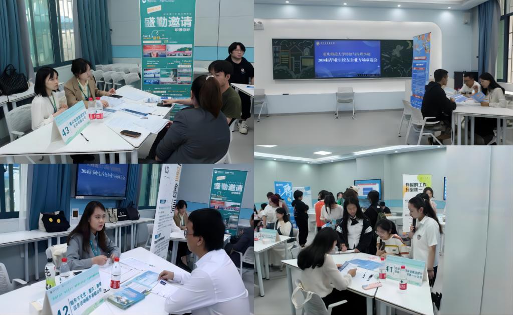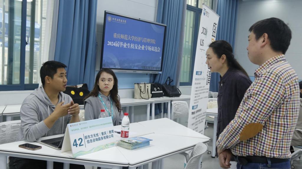 于求是楼126成功举办校友企业专场双选会。学院2012级校友骆明军、2015级校友王双凤等8名校友代表伊利实业集团股份有限公司、重庆新东方教育培训学校有限公司等6家校友企业受邀参加本次双选会,共计提供43个优质岗位。