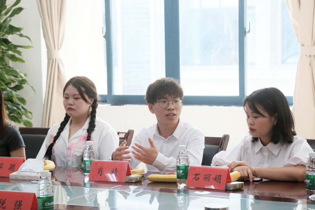 本科生代表黄倩、詹俊朗等同学建议,希望今后能够进一步开展更多丰富多彩的学生活动,使更多同学积极主动参与进来,充实课余生活,提升综合素质能力;同时也建议学院能够开展口才与演讲相关的通识课程,鼓励同学们多主动发言,参与各项活动,培养和提升同学们的口才与演讲能力;另一方面,他们提出,在入学教育中鼓励同学们主动与各位导师联系沟通,拉近与老师之间的距离,结合导师提供的资源,进一步学习和提升自我。对此陈道平副院长表示,同学们一定要主动与导师联系,导师们也会积极帮助各位同学,希望同学们能够抓住机会,不断提升自我。喻科副院长也指出,此次座谈会对于营造学院良好学风,提高学生素质和综合能力具有建设性的作用。