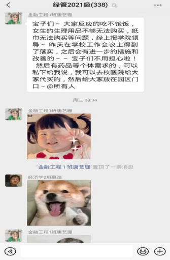 疫情形势严峻,在一线坚守的劳动强度高、责任压力重,而教职工们的严谨认真却始终如一,日常交往中更常以暖心宽慰缓解同学的不安与焦虑。不仅如此,面对学生们反馈的物资缺乏问题,教职工们及时作出调整,想办法为同学们提供更多的物资保障,其中还包括女生的特殊时期用品,他们致力于让学生的基本生活得到保障的同时,感受到学院带来的关怀与温暖,正是他们的付出,促进了疫情防控真正落实到点、密织成网、精准精细、高效周全,使学子们真正感受到情暖若春还,心安即是家!