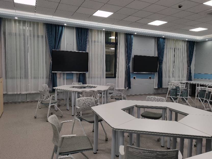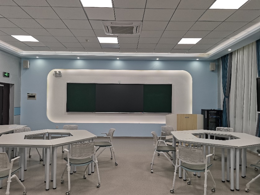 面积约80+ m2 ,采用智能信息化管理,可同时容纳50+名学生开展智慧教学。 配有红外线智慧黑板、投屏终端、多屏互动教师控制系统、学生小组接入端品课软件、智能导播互动资源平台等智能装备,将联动的物理空间和智能数字空间有机结合,可充分辅助教学内容的呈现、学习资源的获取、促进交互开展教学活动;支持本地与远程教学活动的结合,促进教师进行教学研究及高校间的学术交流活动。