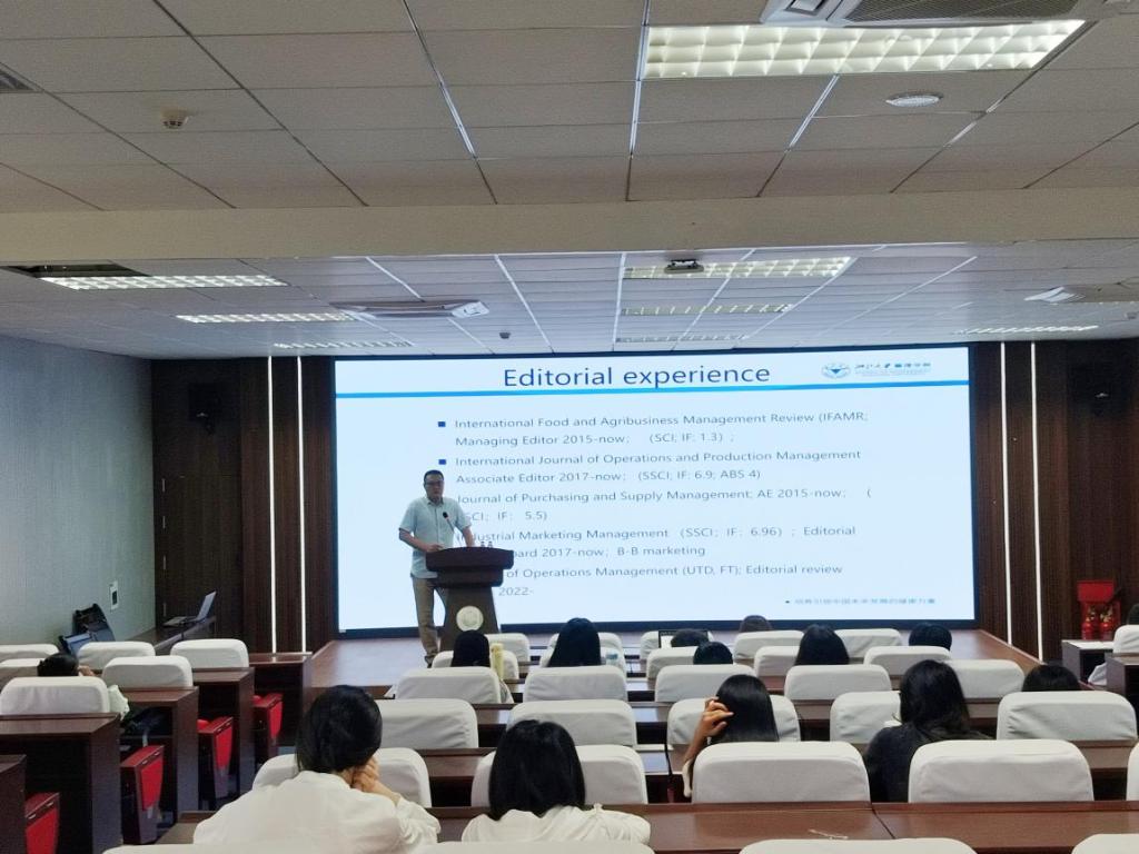 于求是楼517报告厅举办学术讲座,主题为“从平台化到生态化:第三方供应链金融平台如何打造生态系统?——跨组织网络视角”。英国约克大学商业与社会学院供应链管理讲座(全职)教授、可持续性与韧性主题总监贾甫教授应邀主讲,学院副院长陈宇科主持,金融专硕教师及2024级全体学硕、金融专硕学生共同参与。